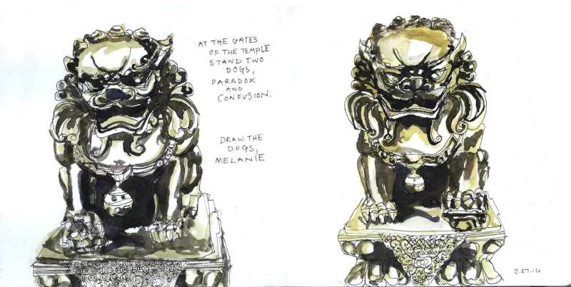 Part 2: Which brings me to looking at my mind, its fears and confusion. I made a drawing this year about this: "At the gates of the temple - the gates of truth - stand two dogs, paradox and confusion."